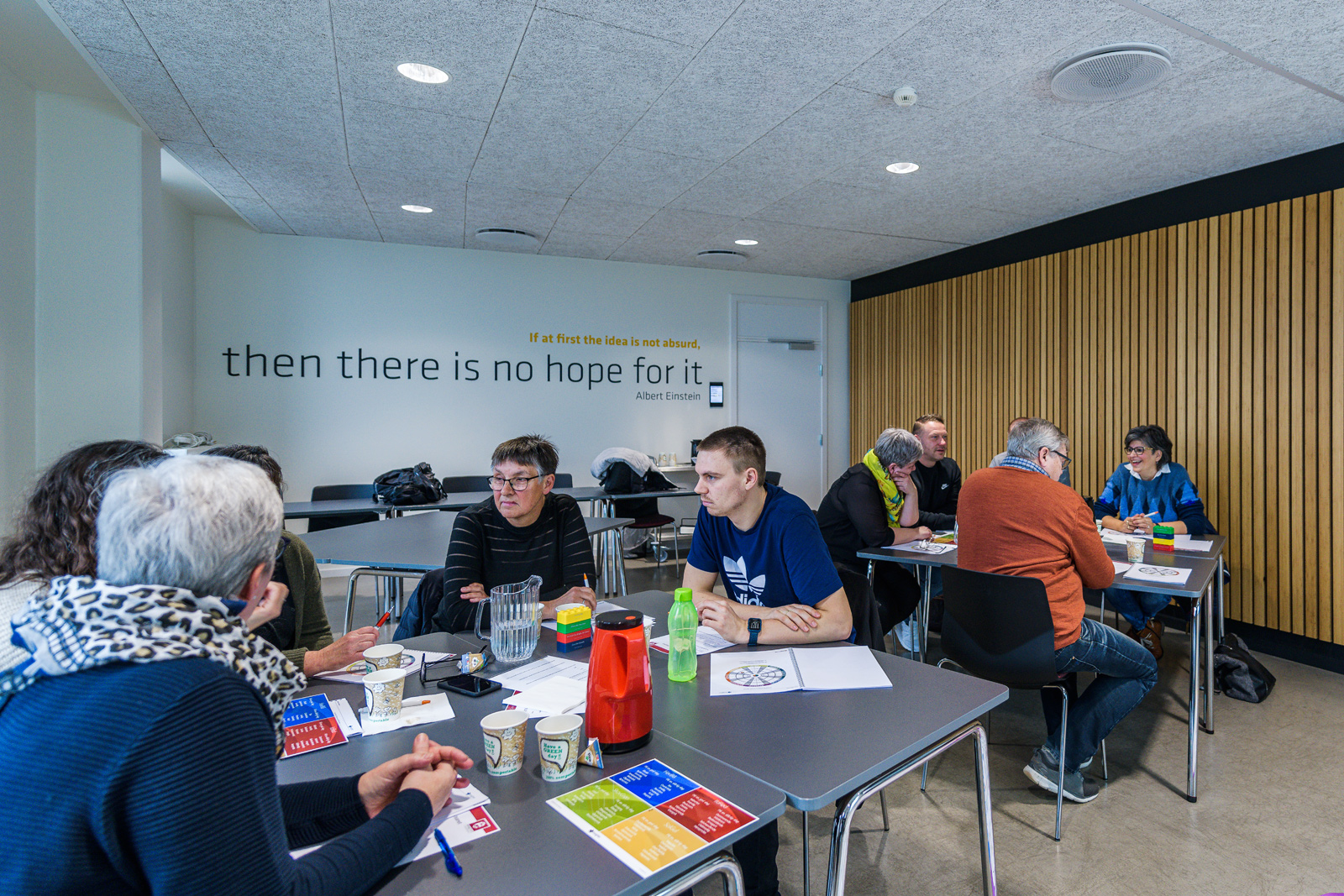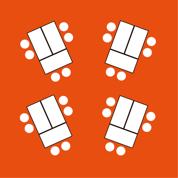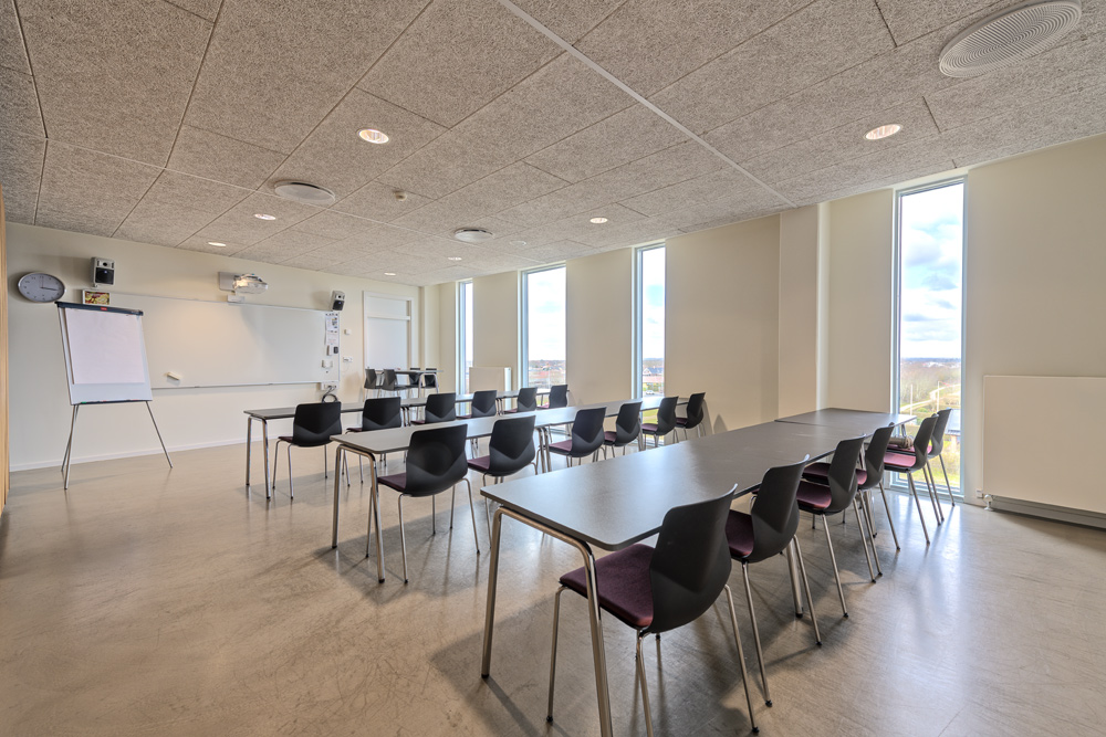Lokalet er indrettet med topersoners borde, som kan placeres på forskellige måder afhængig af kursets formål. Det er dermed muligt at lave både gruppeopstillinger og mere traditionelle klasseopstillinger, så du får det bedst mulige udgangspunkt for dit kursus.
