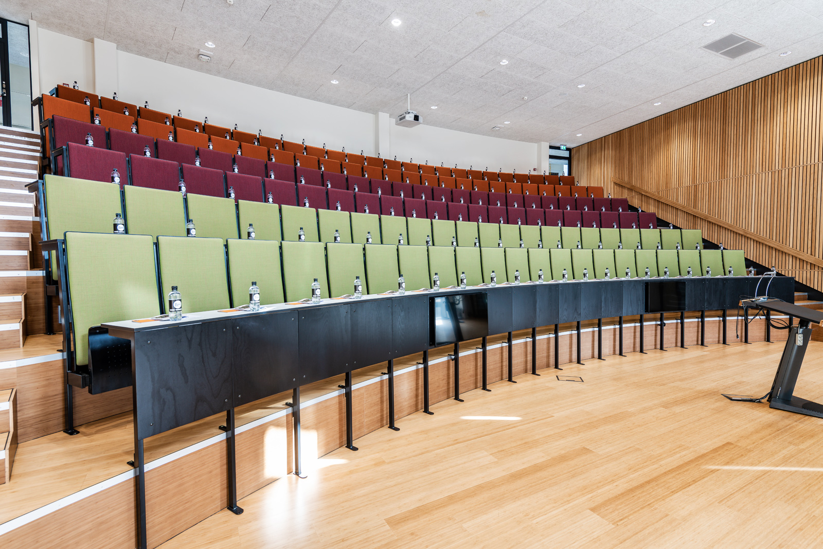 To af rummets vægge er udstyret med bambuspaneler, og loftet består af troldtektplader. Det giver en god akustik i rummet, hvilket er særligt fordelagtigt, hvis du skal afspille lydklip. Siddepladserne i auditoriet er bløde og behagelige, og så er der rigeligt med bordplads.