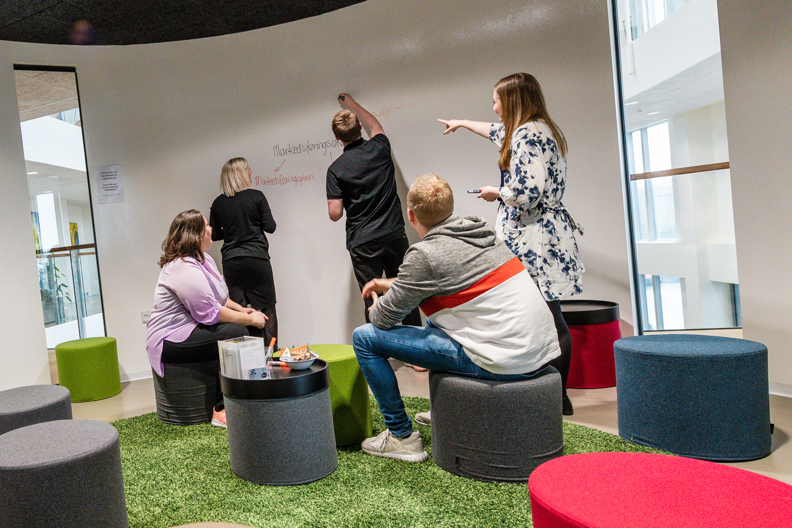 Rummet er rundt, godt oplyst og har masser af vinduer ud til Innovest. Og så er væggene helt særlige. I Hindø må du nemlig skrive på væggene – vel at mærke med de rigtige tuscher – og det giver dig og dine mødedeltagere mulighed for at give tankerne frit spil og illustrere jeres idéer.