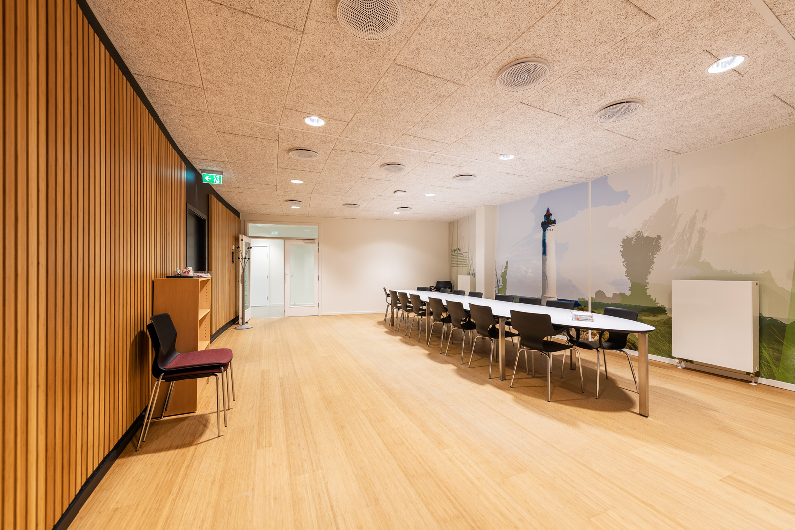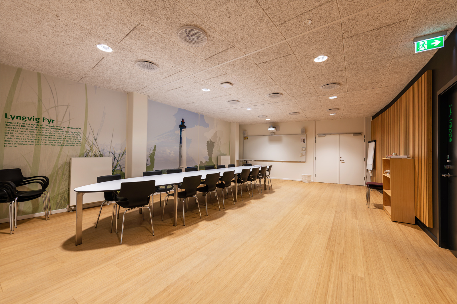 Én af væggene i lokalet er beklædt med bambuspaneler, som sammen med loftpladerne i troldtekt giver en god akustik i rummet. Dermed kan du holde dit møde i et godt og behageligt miljø. Den modsatte væg er prydet med en stor afbildning af Lyngvig Fyr. Det bidrager til, at mødelokalet tilbyder en varm og inspirerende atmosfære.